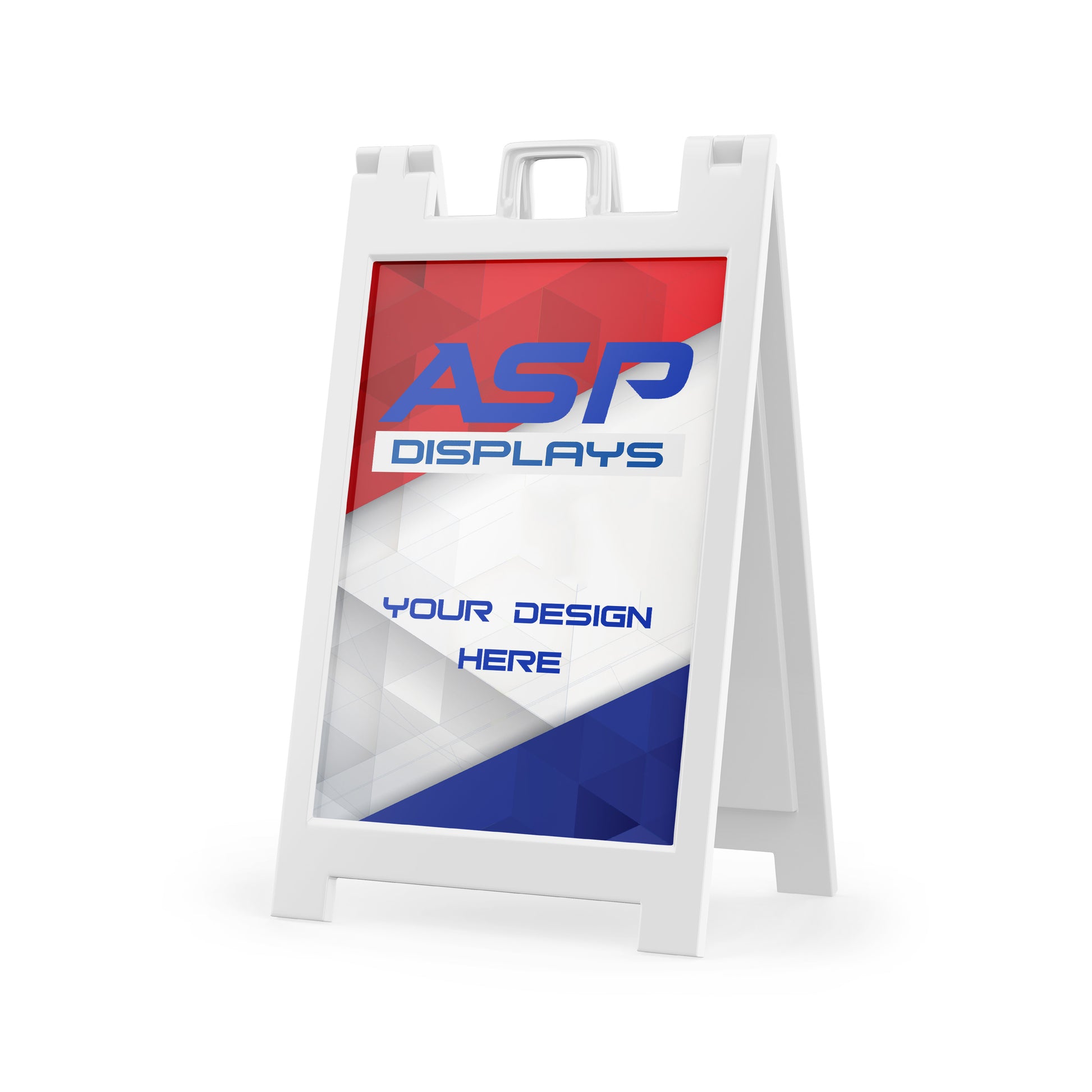 Frames are available in black or white and are made out of durable plastic that prevents rust and splinters. Frame can be filled with water or sand for stability. Set includes two signboards; each signboard is printed single-sided made out of coroplast.