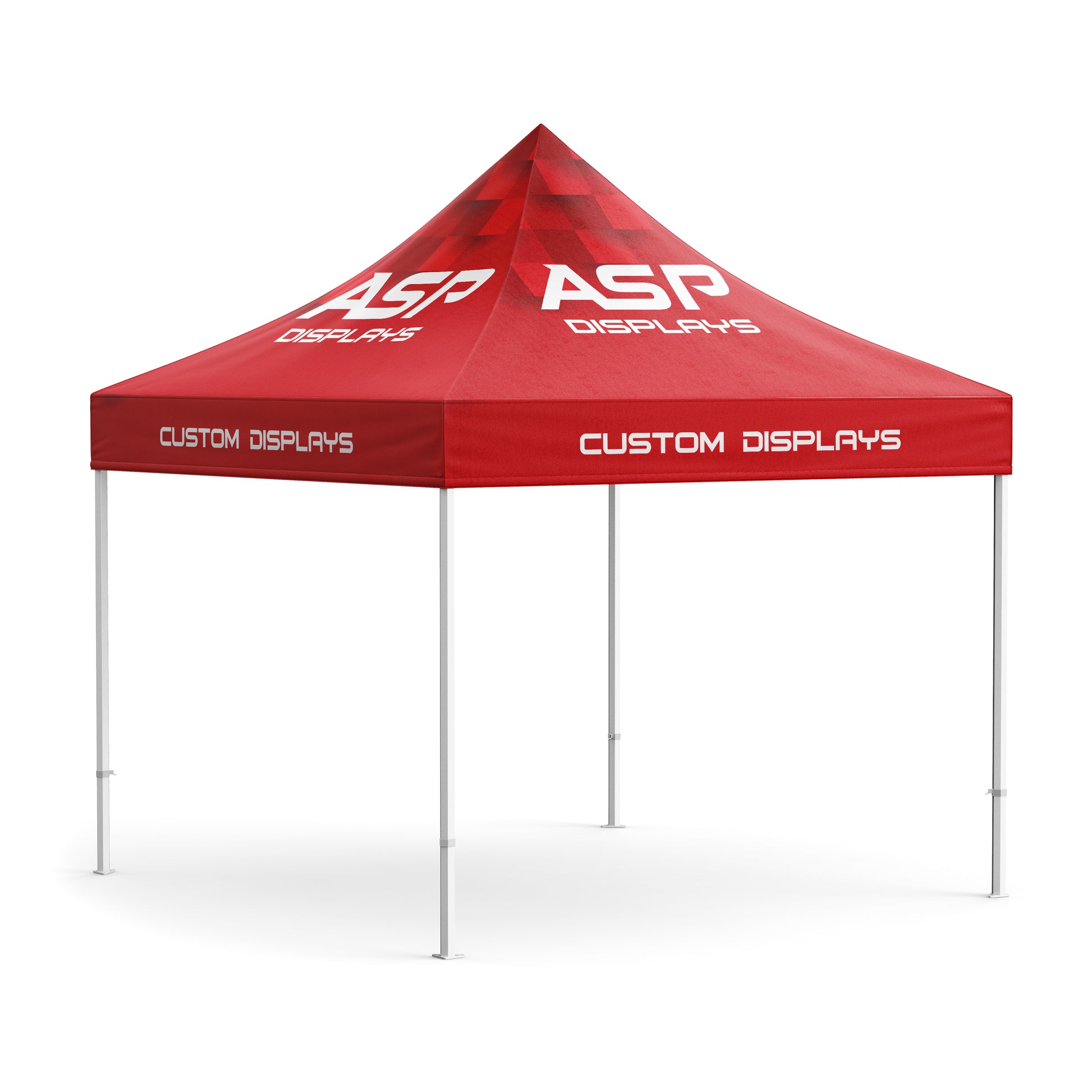 Achieve 360 degrees of branding with a custom full fabric dye sub canopy and hardware package. Canopy is printed and sewn weather resistant tent polyester. Print your brand on each of the four peaks and valance panels. Heavy duty hex shape 40 mm. aluminum hardware gives the tent strength and durability.