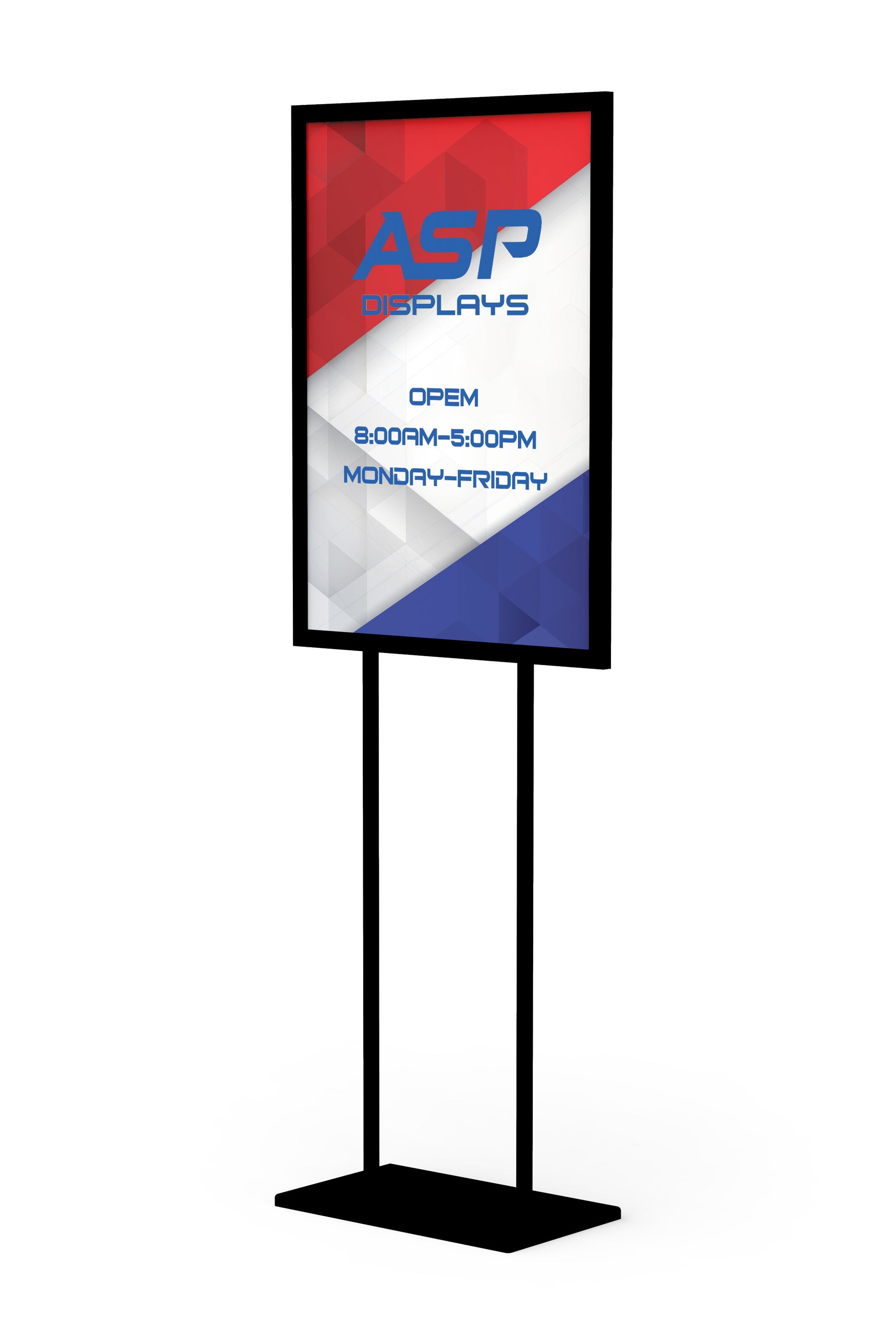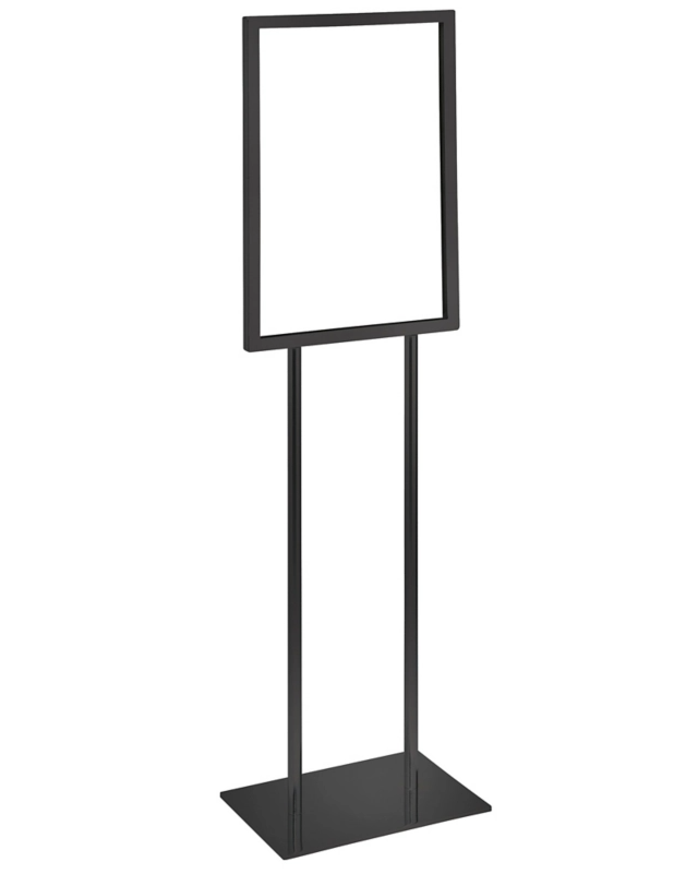 Our floor standing poster stand accommodates a 22"x28" drop in rigid graphic and stands 60" tall. Our direct print double-sided PVC graphics easily drop in the frame for quick display.