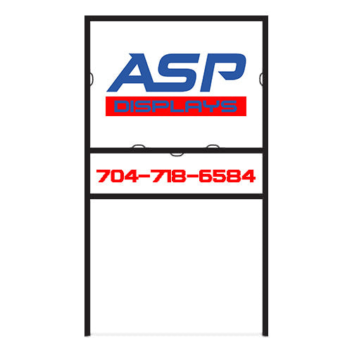 The real estate frame is perfect for advertising. Install in soft ground such as lawns, medians, and fields. The sturdy and durable black coated frame is constructed of steel for maximum strength and longevity. The double-sided coroplast graphics drop into the frame and are held into place with clips. The frame holds 1 double-sided 18"x24" sign and an additional 6"x24" rider.